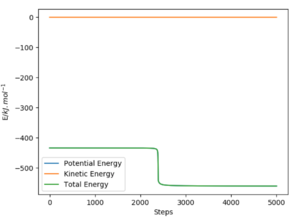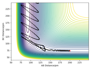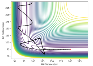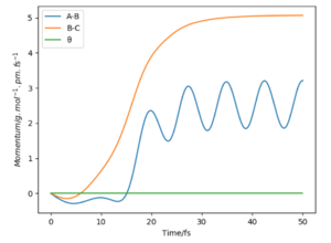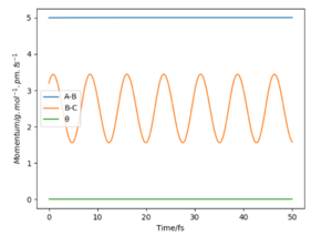 In this reaction, potential energy is converted to kinetic energy. From the momenta time plot above, we can see the potential energy in B-C as the bond is broken converts to kinetic from the oscillating motion of the A-B bond (increase and decrease in momentum on graph). The two possibilities for the release in bond energy from the reactants to the products is through translational or vibrational kinetic energy (rotational and electronic energy are ignored).