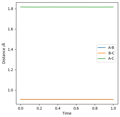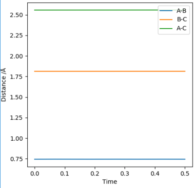 Using AB = BC and setting both momenta to 0, the transition state can be determined using a plot of internuclear distances vs time. The distance was optimised to reduce oscillations and produce a straight line with no trajectory towards reactants or products, which is the definition of a transition state (see graph). The optimised distance was found to be 0.9079 Å.