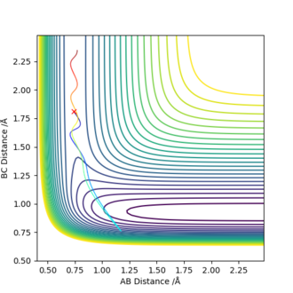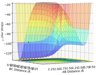 For the reaction of H2 + F, the values of rHH=0.74 angstroms and rHF=1.81 angstroms were used. The left hand figure below shows the contour plot when pAB=-2.5 and pBC=-0.5, having a greater vibrational energy. The right hand figure shows the contour plot when pAB=-0.5 and pBC=-2.5, having a greater translational energy. The figure with the greater translational energy has a successful trajectory, whereas the one with greater vibrational energy has an unsuccessful trajectory.