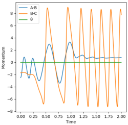 Initial conditions were found that gave a reactive trajectory. These were an AB distance of 0.74 angstroms, a BC distance of 1.80 angstroms, an AB momentum of -2.5 and a BC momentum of -1.70. This produces the Momenta vs Time graph shown below.