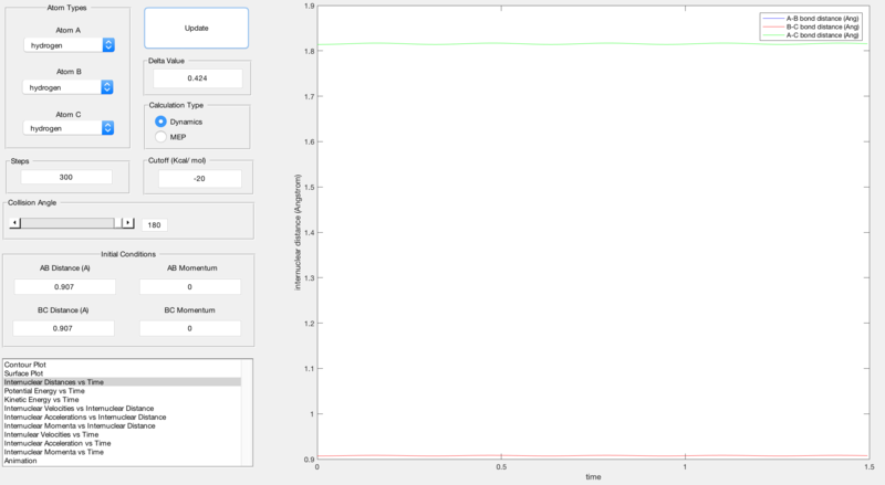 The approximate position of the transition state was found by locating the radii at which the total energy of the system is stationary due to the absence of a net force acting on the atoms. At this point, the internuclear distance against time plot will show constant internuclear separations as seen in Figure 7: