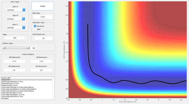 Trial and error were used to calculate a successful reaction trajectory and the parameters used can be seen in the figures below.