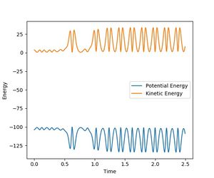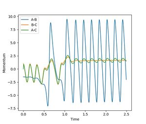 Considering the momentum vs. time plot, it can be seen that the reaction results in an increased and vigorous oscillation of the resulting molecule. It can therefore be concluded that the reaction energy released during the exothermic process is converted into vibrational energy of the molecule. Furthermore, the energy vs. time plot shows an increased oscillation in the kinetic energy of the newly formed molecule.