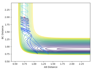 When the initial position is slightly distorted from the transition state (rAB = 0.752 Å, rBC = 1.708 Å and pAB = pBC = 0, Steps:10000), the system follows down the potential hill and forms H and HF as illustrated below in the contour plot. By distorting the initial position from another direction (rAB = 0.752 Å, rBC = 1.908 Å and pAB = pBC = 0, Steps:20000), the system follows down the potential hill in the opposite direction and F + H2 are formed instead. This confirms that the transition state is located at rAB = 0.752 Å and rBC = 1.808 Å as this is the maximum point along the direction of the reaction path.