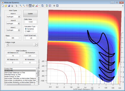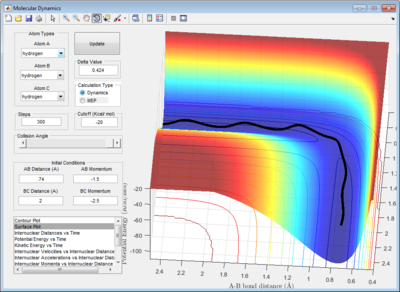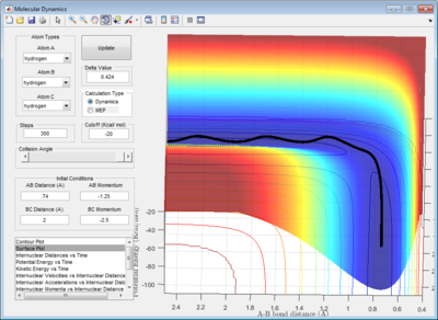 In the mep calculation, rAB was set at 0.91775Å, which is slightly displaced from the previously determined rAB distance of 0.90775Å at transition state. Step size was set at 20000. This was done so that the slight perturbation allowed to system to proceed towards either the reactants or products, instead of remaining stationary on the maximum point of the transition state. In the mep calculation, vibrational energies are assumed to flow in and out of the system during the reaction such that it remains zero throughout. [2]