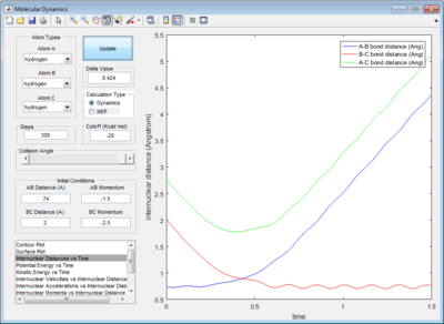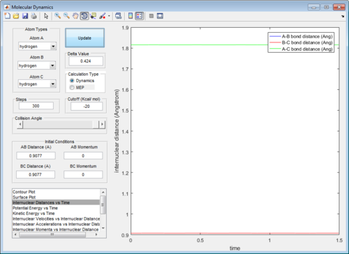 In addition, the animation showed that the oscillation of AB, BC and AC bond distances with time were so slow that it was not possible to visually observe a change in the position of atoms A, B and C with time.