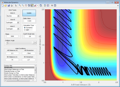 The F + H2 reaction is exothermic while the H + HF reaction (backward reaction) is endothermic, as can be observed in the potential surfaces obtained by a dynamic calculatoin at step size = 3000. (Figure 8) This is expected, as the H-F bond (-567 kJ mol-1[6]) includes ionic contributions not found in H-H bonds (-432 kJ mol-1[6]) as a result of the electronegativity of the F atom and will hence be stronger.