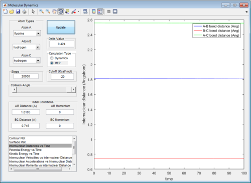 9. Identify a set of initial conditions that results in a reactive trajectory for the F + H2, and look at the “Animation” and “Internuclear Momenta vs Time”. In light of the fact that energy is conserved, discuss the mechanism of release of the reaction energy. How could this be confirmed experimentally?