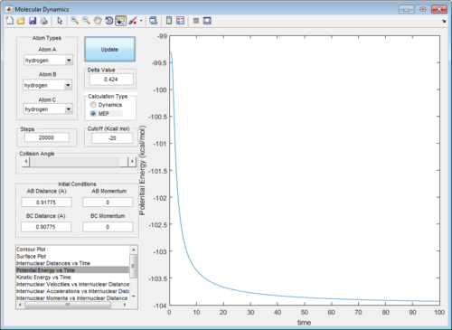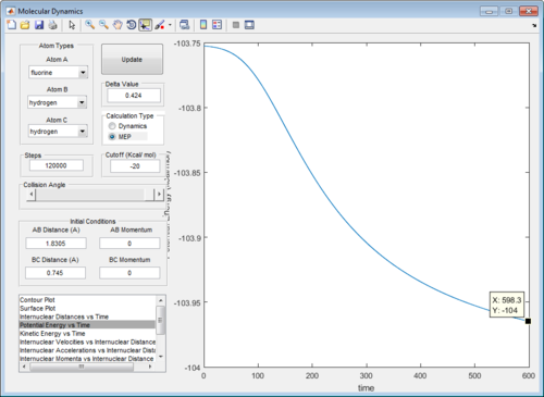 The presence of vibrational energies in a dynamic calculation makes it hard to determine accurately the activation energy. Running an mep calculation removes these vibrational energies and greatly simplifies the determination of activation energy. Plotting the potential energy vs time, the activation energy for this reaction is determined to be 4.7 kcal/mol. (Figure 5)
