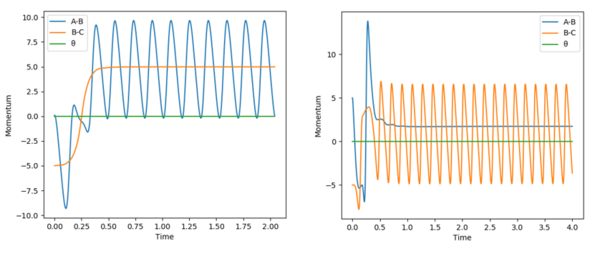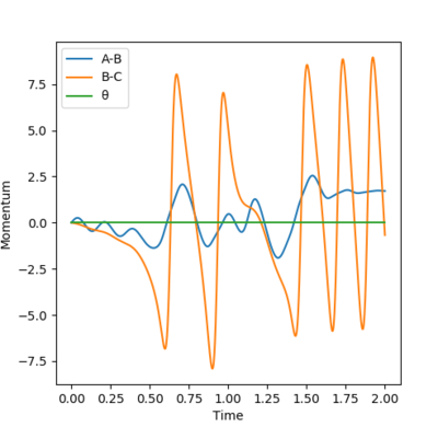 For a dynamic Momentum vs. Time plot and from the animation, it can be seen that the energy that was released from forming the H-F bond goes into a large increase in the B-C oscillation. The A-B momentum tends to a fixed value as they tend towards being far away from each other. It can therefore be inferred that the chemical energy is being converted into kinetic energy, which, on the molecular level, corresponds to an increase in temperature.