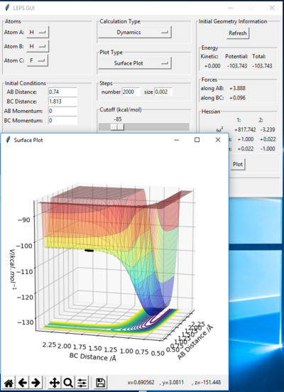 In the example below in Figure 9, the conditions were rH-H=0.74 and rHH-F=1.6 and with all initial momentum=0 (pushing the reaction to the forward side).