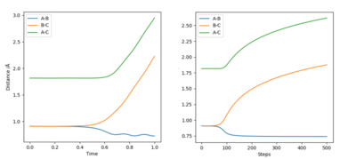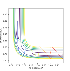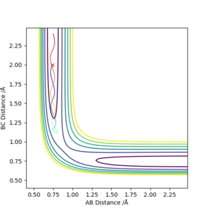 Similarly, if the AB Distance ≠ BC Distance, even by a small amount (0.001 Å), there is a trajectory line plotted (i.e. the A-B and B-C lines start to increase away from the transition state). This is exemplified in Figure 3 below: