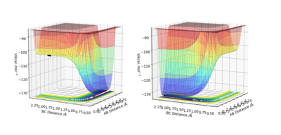 Additionally, we see that the internuclear distance goes further away and is a steeper, more linear graph in the dynamic plot, and probably plateaus out at a much further distance (this can be seen by the black line travelling farther in Figure 4.), while the MET plot has a rectangular-hyperbola-like shape. This can be explained by the fact that the dynamic plot includes the momentum of the particles after the initial repulsion, whereas the MET plot takes a stationary point at each step, thus ignoring any momentum. If it was rAB=rts+δ and rBC=rts instead, the B-C line would tend to the 0.75-0.77 distance while the A-B line would increase away, basically the reaction would go in the opposite direction.