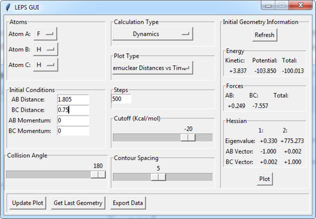 Another thing I’d like to point out is that if you think one momentum is equivalent to vibrational energy and the other momentum is equivalent to translational energy, this is not true. When you add the momentum into the system, you are just adding the kinetic energy. But whether this kinetic energy goes to translational or vibrational energy, you have some control, but not all of them. The best way to read the vibrational energy is to see how many contour lines the trajectory has passed (i.e. how far away it is from the minimum energy path). Therefore, changing the momentum of the molecule is not the only way to change the vibrational energy, you can also change your starting point (i.e. the molecule bond length). --Sw2711 (talk) 11:23, 18 May 2018 (BST) I hope that makes sense. --Sw2711 (talk) 11:23, 18 May 2018 (BST)