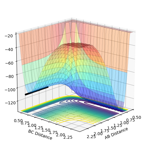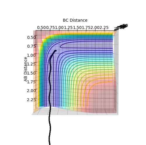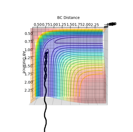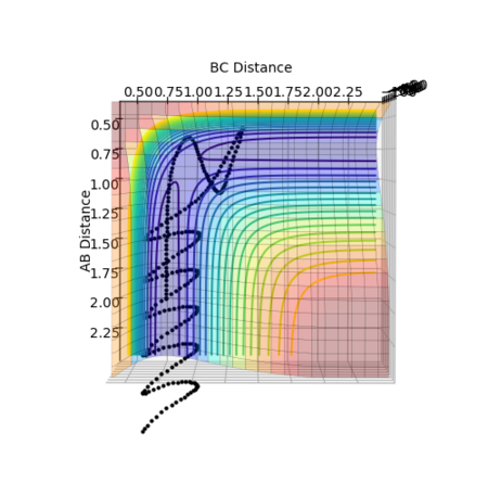 From figure 2, it is seen that the trajectory calculated using mep appears to be a straight line. This is due to the fact that mep shows an infinitely slow motion of reaction path. As velocity is set to zero at every time step, the momentum and thus kinetic energy is also zero at each time step. This results in no oscillation motion and hence a straight line of the trajectory.