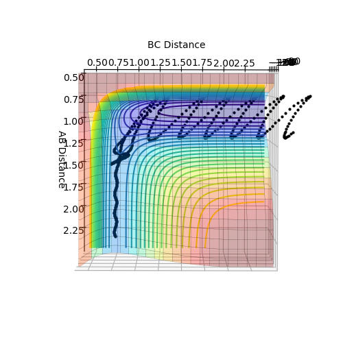 In figure 21, The initial conditions applied are of low vibrational energy with high translational energy, such that the the trajectory is expected to be unreactive according to Polanyi's empirical rules. Yet, a reactive trajectory is shown that it disagrees with the theory once again.