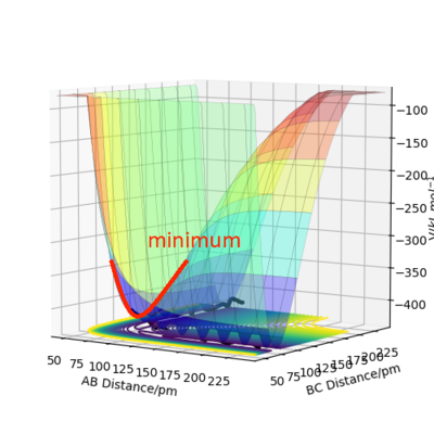 The approximate position of transition state for my F-H-H system is r1 = 181.300 pm and r2 = 74.483 pm, with atom A = F and atom B = atom C = H. Potential energy at transition state was -433.981 kJ.mol-1. Good. Mak214 (talk) 18:39, 13 May 2020 (BST)