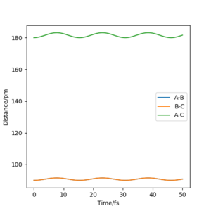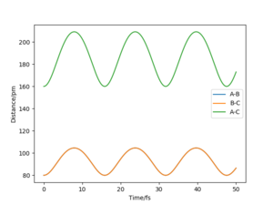 My best estimate of rts is 90.774 pm. The internuclear distances against time graphs only show B-C and A-C curves as A-B overlap with the B-C curve in this symmetric r1=r2 system. The system oscillates around the transition state if it starts somewhere close to the transition state point with 0 momentum (p1=p2=0). In this situation, the internuclear distances against time graph should show oscillations over time, just like the graph below.