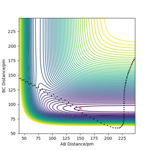 Contour Plots for F + H2 Reaction (Atom A = F, r1 = 183.000 pm, r2 = 74.000 pm)
