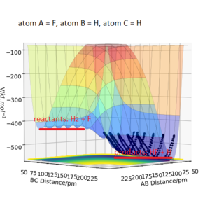 F + H2 is an exothermic reaction from the shape of the minimum energy path shown. H + HF reaction is therefore an endothermic reaction. This implies H-F bond is stronger than H-H bond as formation of H-F bond releases more energy than the breaking of H-H bond in the exothermic F + H2 reaction. Good. Would be nice to find some references and quote the experimental enthalpy values for these reactions. Mak214 (talk) 18:39, 13 May 2020 (BST)