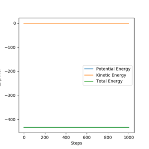 The activation energy for the exothermic F + H2 reaction was 0.233 kJ.mol-1. It was calculated using the potential energy of reactants (F and H2), -434.215 kJ.mol-1 and the potential energy at transition state, -433.981 kJ.mol-1. The potential energy of reactants was calculated by displacing the initial position slightly towards the reactant side. From plotting the energy against time graph using these conditions, the total energy gradually stabilised at the reactant energy level.
