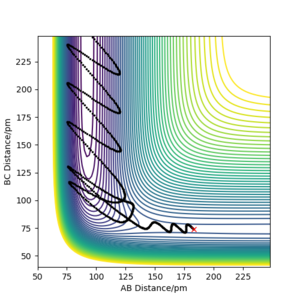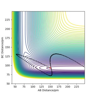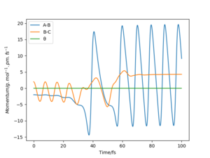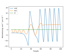 In contrast, the trajectory calculated by dynamics shows periodic oscillations in both the contour plot and the momentum plot. This is because an H2 molecule has been formed and it gained vibrational energy from the reaction. The total energy is conserved in dynamics, hence gain in kinetic energy = loss in potential energy.