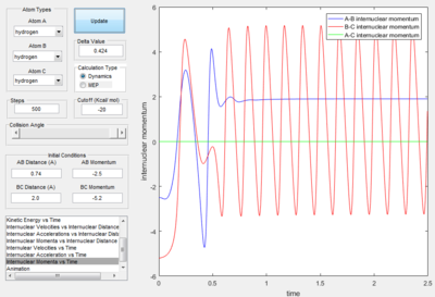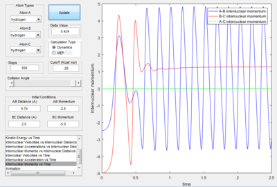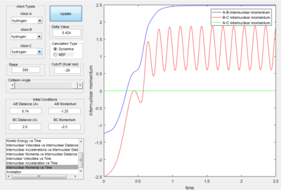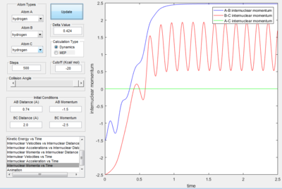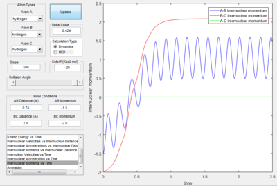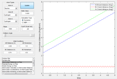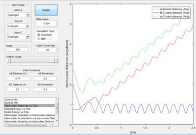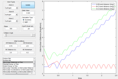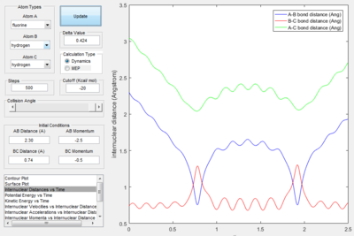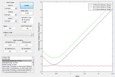 - As explained previously at transition state, the total gradient of the potential energy surface is zero. By plotting a surface plot with r1(0)=r2(1)=0.74 A (bond length of H-H bond), the maximum of minimum energy path gives the transition state distance: 0.9076 A. Internuclear Distance vs. time plot showed AC distance approximate to 1.8 A twice the BC bond distance Thus the bond distance between AB and BC dose not change. The system is in a transition state.