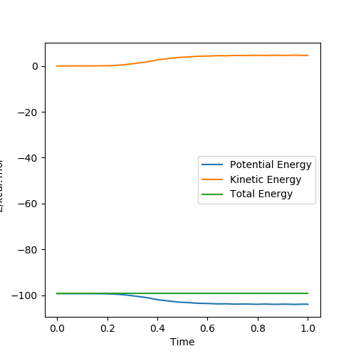 Because now the total energy is conserved,so the calculation type needs to be changed to dynamics.The initial conditions of F+H2 is set to be r1=1.90,r2=0.74,p1=-0.8,p2=-0.2.