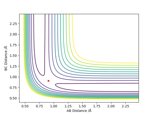 When the distance HF is changed to be 0.745,a structure neighbouring transition state is obtained.Because the distance HF is smaller than the real distance of HF in transition state,so the reaction tends to move towards reactants F and H2.As seen on the graph,the difference between highest energy and lowest energy is calculated to be the activation energy.