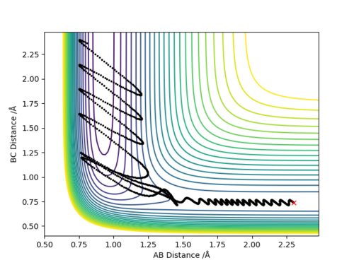 Q4:Complete the table above by adding the total energy, whether the trajectory is reactive or unreactive, and provide a plot of the trajectory and a small description for what happens along the trajectory. What can you conclude from the table?