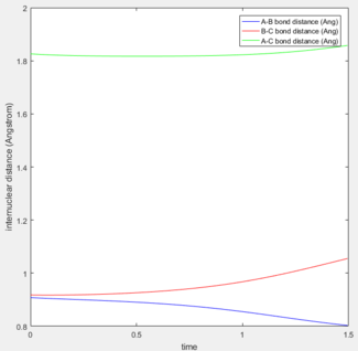 The above internuclear distance vs time plots show the path of the reaction starting from the transition state, when r2 = rts = 0.9078 Å and r1 = rts + 0.01 and the momenta p1 and p2 set to 0.