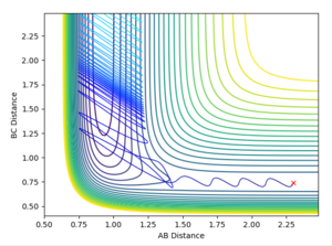 Hammond's postulate says the transition state structure will be closer to the products' structure in an endothermic reaction. Because AB is the bond that's broken and corresponds to the H-F bond length and it's the bond being broken, you'd expect the transition state to resemble H2 more closely, hence the BC distance will be smaller. The initial guess for the transition state was r1(AB)= 1.5 Å and r2(BC)= 0.5 Å. The outcome of this can be seen in Figure 18. The best estimate would have no path line and just a cross so a much better guess was needed.