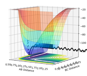 So slightly away from the transition state. The mep then shows the lowest energy pathway of the molecule B-C forming - so the distance between the two atoms gets smaller - and the distance between B and C gets larger (Figure 4). It is a straight line with no oscillations (Figure 6).