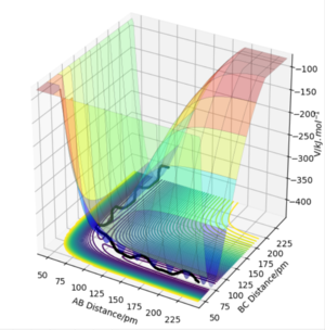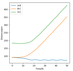 Initial conditions that result in a reactive trajectory: rAB = 150 pm, rBC = 80 pm, pAB = 0 g.mol-1.pm.fs-1, pBC = 0.5 g.mol-1.pm.fs-1.