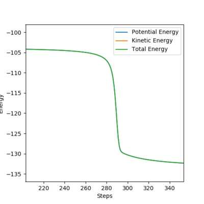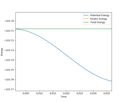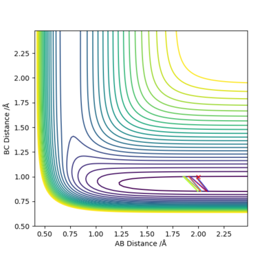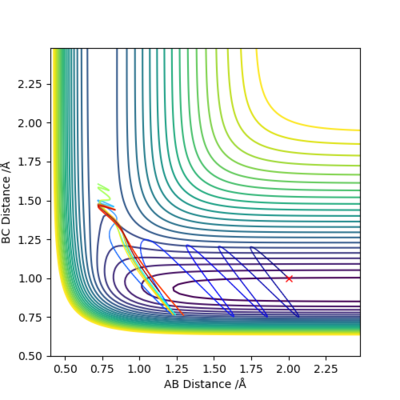 In the MEP trajectory, the motion of molecule is infinitely slow that the momenta is reset to zero in every time step. This effectively takes the vibrational energy out of the system. Therefore, smooth line is shown MEP trajectories, when wavy line is shown in dynamic trajectory. Comparing figure 6 and figure 7, the Dynamic trajectories shows linearly increasing internuclear distance, and the MEP trajectories show decrease in the gradient. This is because MET plot is taken as each point being stationary (zero momenta), when the dynamic plot includes the momentum. Good. Mak214 (talk) 16:19, 23 May 2019 (BST)