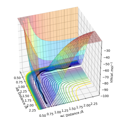 Not really. R1 and R2 are not the dimensions in which you are looking for the maximum and minimum. You need to define two new vectors q1 and q2 and take the partial differential of V -the potential energy, relative to these. You will see when you look at the surface plot that q1 is a line that passes through the origin and obeys R1 is equal to R2, V has a minimum along this line. q2 is at 90 degrees to q1 and follows the reaction coordinate AB + C to A + BC, V has a maximum along this line.Mak214 (talk) 16:19, 23 May 2019 (BST)