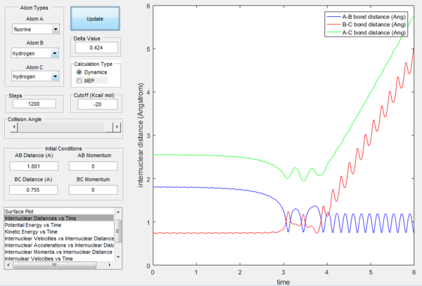 At the transition state, it is expected that no movement of atom will be seen. As shown in Figure 14, this holds true when rHF is 1.8111 Å and rHH is 0.7456 Å. The three atoms stay in constant position as no change in intermolecular distance is observed over time. Value of zero will be obtained if the first derivative of the curve is taken, proving that it is where the transition state is located.