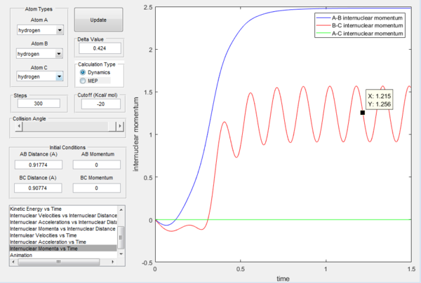 Since the H + H2 surface is symmetric, it is expected that at the transition state, all three atoms are at equal distance to each other (ie. r1 = r2). By referring to Figure 1, rts can roughly be determined as 0.9148 where r1 and r2 plot crosses. To obtain a more accurate value of rts, intermolecular distance versus time graph is used as shown in Figure 2. Since r1 = r2 and there is no net force acting on the atoms, momentum is at 0. At distance = 0.90774 Å, there is no change at the positions of atoms and the bond lengths remained constant. No movement of atoms indicating the occurrence of a transition state.