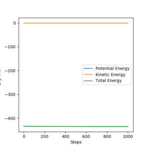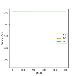 -5.1 | -10.1 | -357.277 KJ.mol-1 | Yes | Plot shows the trajectory having an "excess" amount of momentum causing the H atom in the middle to bounce back and forth between molecules. The trajectory eventually goes to the product but does not go through the transition state This calculation should result in system recrossing wherein the trajectory goes past the transition state but then returns to the reactants. Pu12 (talk) 21:06, 11 June 2020 (BST)