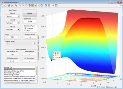 From the surface plot, the trajectory started off with a smaller amplitude and it changed to a much greater amplitude after passing the transition state. Both plot indicated that product HF had greater vibrational energy than reactant. Since the reaction is exothermic, the energy released during the reaction can be absorbed back by HF and stored as vibrational energy.