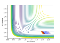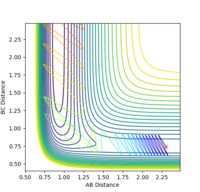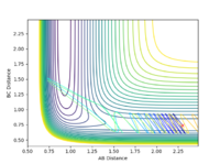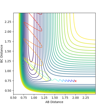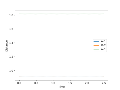 - The transition state position is estimated at r1=r2= 0.908 Å. The “Internuclear Distances vs Time” plot shows two almost flat lines, indicating that the atoms hardly oscillates and are close to an equilibrium. The distance of AB equals to the distance of BC so the two lines overlap.