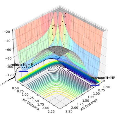 When the momentum pFH is increased slightly from -0.5 to -0.8 with pHH being only 0.1, the reaction now becomes successful. It indicates that the F-H vibration energy has a larger contribution for the feasibility of this reaction compared to the translational energy which is the kinetic energy of the hydrogen atom which is defined by the momentum pHH
