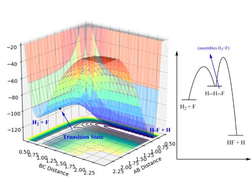 - The distance between H and H is determined to be 0.745 Å and the distance between H and F is determined to be 1.810 Å. The “Internuclear Distances vs Time” plot confirmed this position. The activation energy for the endothermic reaction is much higher than the exothermic reaction. Because the transition state resembles the H2+F species and they have similar energies.