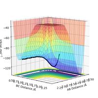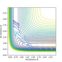 The minimum energy path will be formed just from consideration of the momentum of the bonds at every particular reaction coordinate, without consideration of previous momentum. This means that an MEP plot will not show vibrations, only the direct path leading to the transition state. The line stops at the transition state as this is the point at which the gradient is zero, and there is no momentum to consider. In the dynamic situation, the path goes beyond the transition state as there is residual momentum in the system. Residual momentum is also the reason vibrations can be seen in the dynamic approach, momentum is not set to zero at each point on the surface so any vibration occurring initially will carry through the path. In each case, the path is represented as the colour gradiated line on the contour maps below, with the red cress representing the transition state.