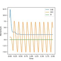 Upon proton transfer, the vibrational energy present in the H-H bond is transferred to the vibrational energy in the H-F bond. This will increase the momentum of HF and decrease that of HH, as shown in the graph below. The program can confirm that energy is conserved by looking at the energy vs time graph, as potential end kinetic energy exactly mirror each other as the molecules vibrate and interact< In the end, the H atom poseses only translational energy whilst the HF molecule contains both vibratinal and translational energy.