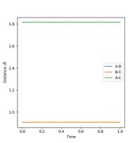 The best estimate of rts we could find is 0.9075 Å. As the transition state will be completely symmetric (by Hammond's postulate, the transition state is neither early nor late so will not resemble either the reactants or products more closely), both rab and rbc will be the same. At this point, the system has no potential energy, so no oscillations should be observed on a graph showing internuclear distance vs time. The graph for this is shown below.