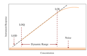Schematic of an instrument response curve. LOD = limit of detection, LOQ = Limit of quantitative measurement, LOL = Limit of linearity.