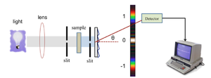 Diffraction grating: The grating splits the white light into individual wavelengths. See below for more details. The grating should be placed near the exit slit.