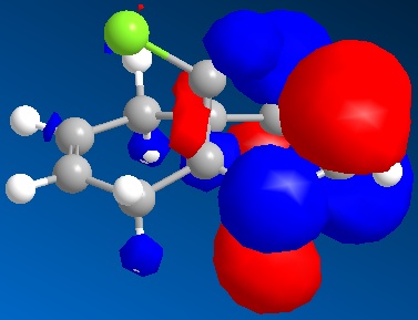The inclusion of Molecular Orbitals using the MOPAC calculations showed that the two alkenes do not have the same reactivity. The HOMO is situated on the alkene situated on the left ring in the figure, i.e. the ring situated on the same endo to the chlorine. This means that this is the alkene more susceptible to electrophilic attack. MOPAC/RM1 or PM6 methods hence allow us to distinguish between the two alkenes. The reaction with dichlorocarbene would proceed with the more reactive alkene endo to the chlorine atom [6]. This can be explained by the stabilising of the exo alkene by anti-periplanar interactions of the Cl-C σ* orbital (LUMO+2) and the exo-alkene π-orbital (HOMO-1). This also explains the distorted geometry mentioned above. The alkene exo to the chlorine is closer to the bridgehead than the endo alkene because of this anti-periplanar interaction. More importantly for the reactivity, this interaction results in rendering the endo-alkene more Nucleophilic in a frontier orbital and electrostatic sense.