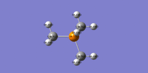 The phosphonium cation charge distribution (fig. )was also as expected, phosphorus is in the same group as nitrogen but just below it, i.e. it's electropositive and hence bright green(remembering that electronegativity is at its highest at the top right corner of the periodic table). Curiously, the hydrogen atoms appear to be a darker shade of green which would indicate that they are not as electropositive as in the nitronium cation; the charge numbers prove that they are in fact more electropositive (nitronium hydrogens: 0.182 whereas the phosphonium hydrogens: 0.193). The carbon atoms appear to be a brighter red which suggests they are slightly more electronegative; again confirmed by charge numbers (nitronium C: -0.196/ phosphonium C: -0.511) This is probably the case because they are bonded to a very positively charged phospohorus which is making the carbons less electropositive in comparison.